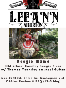 I’m in Encinitas, California- on the beach! I have 2 steady gigs at the Encinitas American Legion- 1st Sunday is Happy Church (like Hippie Church in Austin!) and 3rd Sunday is Boogie Mama’s Old School Country Blues. I have 2 separate bands and I get to scratch my itch, while boogie boarding daily! I felt a little like a traitor when I left Austin, but now I am getting into the beach groove. I love you!